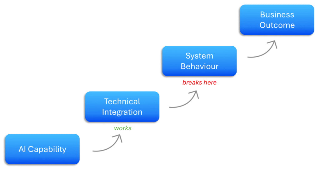The real disruption surfaces after deployment. While AI-enabled solutions often work as expected in test environments, production exposes how end-to-end systems actually behave at scale (McKinsey). Exceptions increase, manual interventions reappear, and outputs become inconsistent across workflows. At this point, leaders realise the issue is not AI capability, but how AI has been integrated into legacy systems and existing business processes (Gartner). By that stage, teams are spending more time managing the side effects of integration than realising any meaningful value.