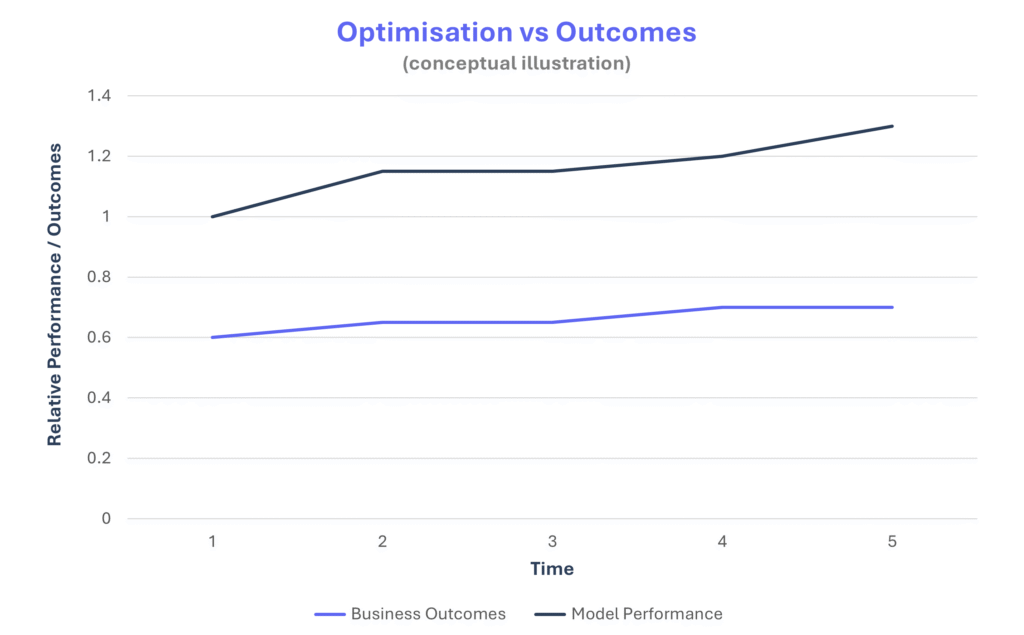 Teams continue optimising what is measured and rewarded. If model performance and operational efficiency are tracked, they improve. Local optimisation happens at the model level, but system-level performance may not move. Gains are absorbed elsewhere in the workflow. What often remains unmeasured is whether these improvements translate into real business value.